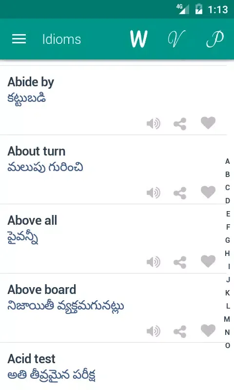The app categorizes words into distinct groups, allowing you to focus on specific areas of interest or difficulty. Each category contains a curated list of verbs, phrases, and idioms, ensuring that you can learn systematically and effectively. Additionally, you can mark your favorite words for quick reference and focused practice. This feature is particularly useful for reinforcing key concepts and improving retention.