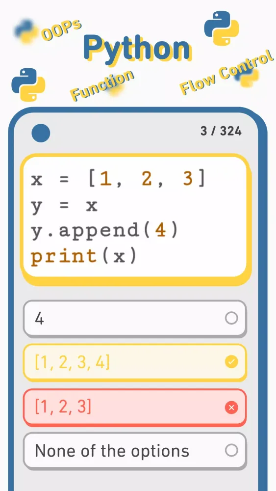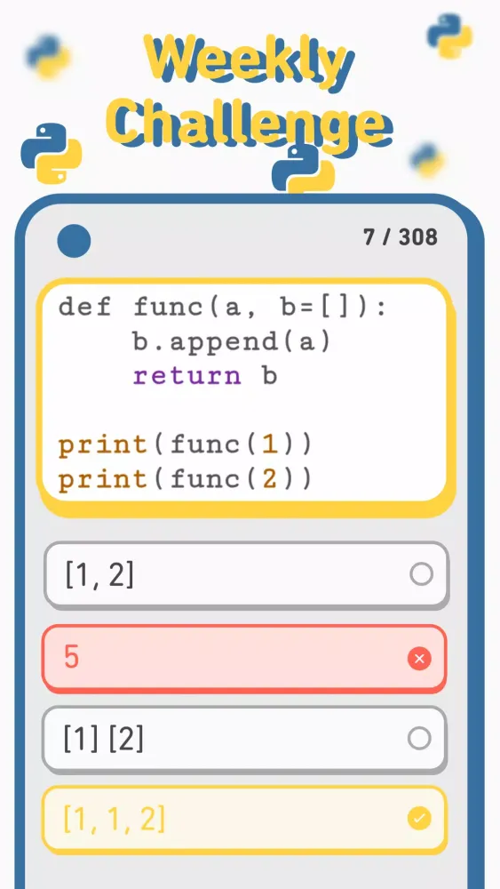One of the standout features of the app is its Weekly Challenge. Each week, the app introduces fresh and thought-provoking questions covering various aspects of Python. These challenges are carefully crafted to keep you engaged and motivated, encouraging continuous learning and practice. Whether you're brushing up on foundational concepts or exploring advanced topics, the Weekly Challenge ensures that you stay ahead of the curve.