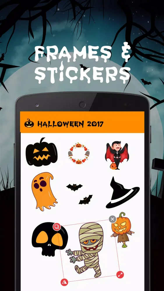 - Photo Frames: Add a touch of Halloween magic to your photos with our unique photo frames. Dress up your selfies and family pictures in witches' hats, pumpkin heads, and more!