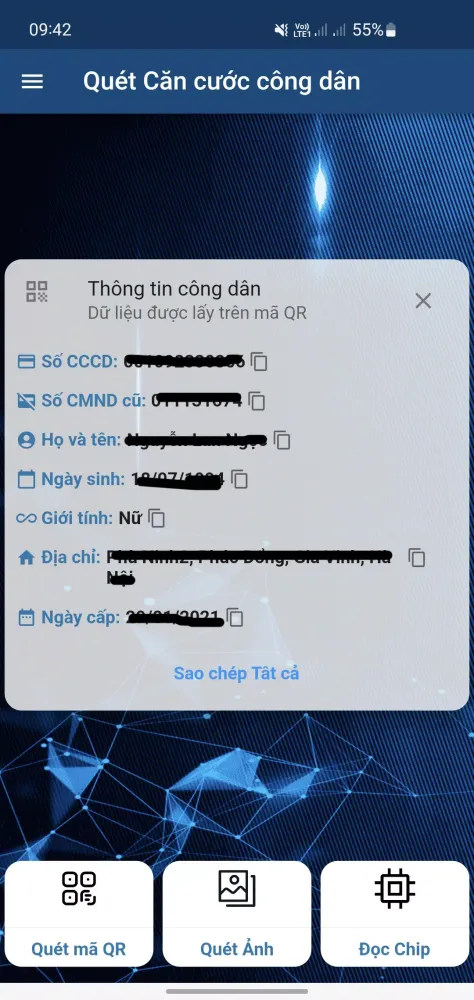 With this application, you can easily scan the QR code on the CCCD card or a snapshot of it stored on your phone. It also allows you to look up the old ID card number and access the information stored on the CCCD chip, including images that can be saved as PDF files to your computer. Additionally, there is a function to copy the information directly from the CCCD card.
