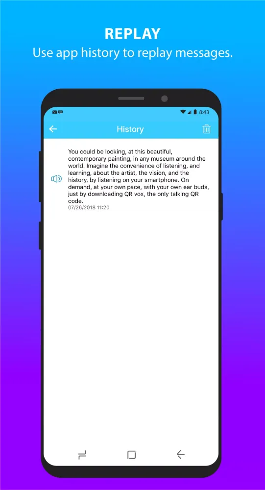 One standout feature is the ability to store scanning history and replay vocalized content messages. This makes QRvox not only functional but also practical for repetitive tasks or when reviewing previously scanned information becomes necessary. Imagine revisiting a product's specifications or re-listening to important instructions without the hassle of rescanning—a simple tap and you're good to go.