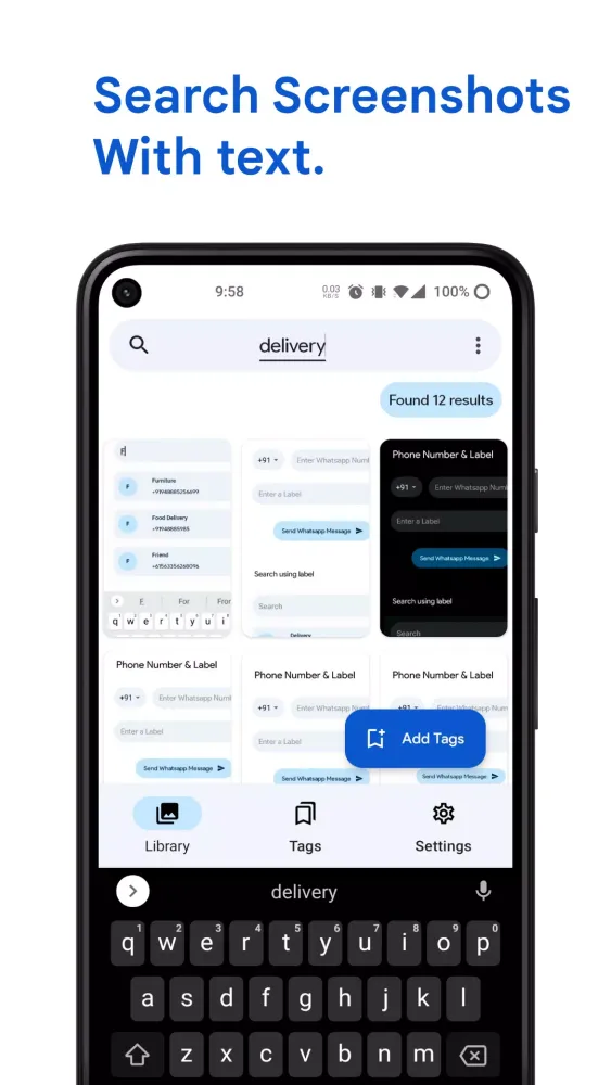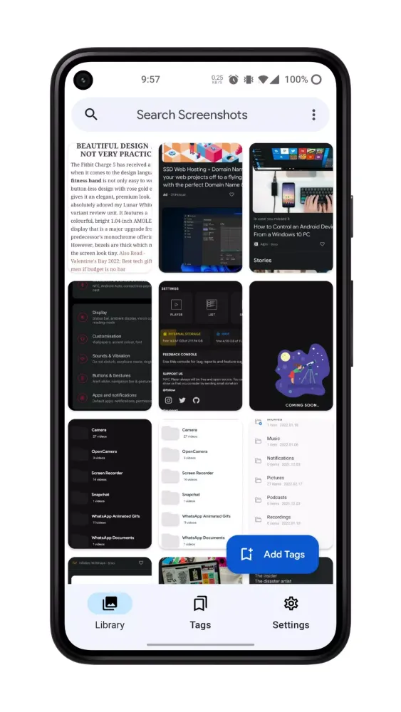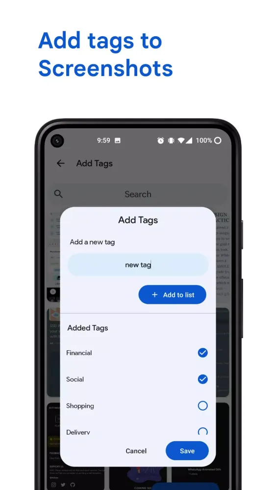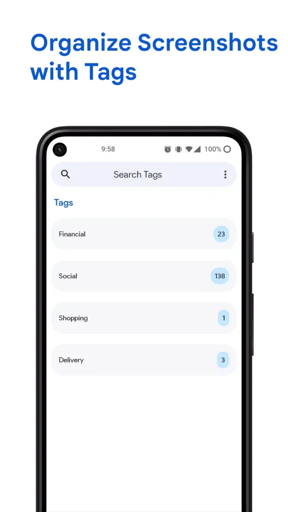 You can easily access screenshots using tags. Navigate to the tags page to see all your categorized screenshots. Social and financial tags are added automatically based on the text in your screenshots. You also have the flexibility to add new tags and manage them as needed.
