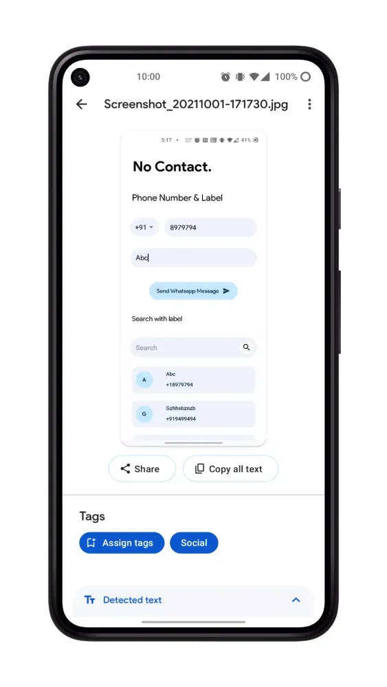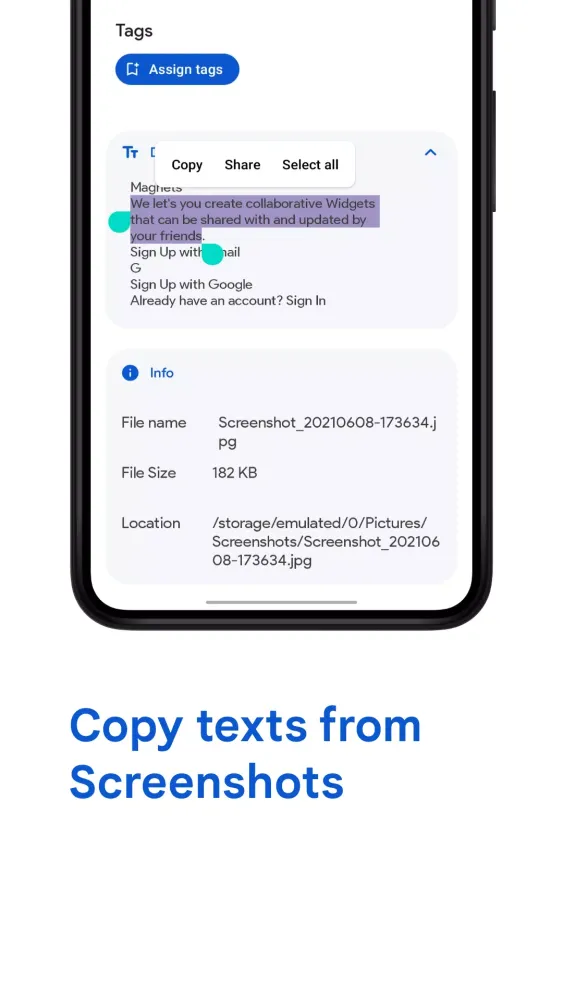 Screeny allows you to extract text from screenshots with just one tap. Once extracted, you can copy the text for various actions such as searching for products, sharing quotes, opening links, or anything else you might need. Selecting a screenshot from the list opens a page displaying the detected text card, where you can copy all the text in the screenshot.