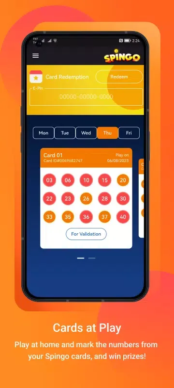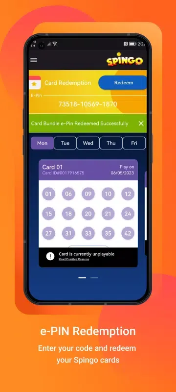 The Spingo app offers several intuitive features designed to enhance your gaming experience. The e-PIN Redemption section lets you easily redeem either single or multiple e-PINs, making the process smooth and hassle-free. Once your cards are redeemed, they will appear under the Spingo Cards tab, where you can tap or untap numbers based on your strategy. For those who manage to complete their cards by marking all 15 numbers, the Blackout Cards feature allows you to submit your validated cards and track them in a dedicated list.