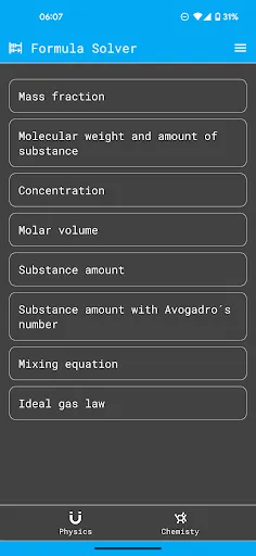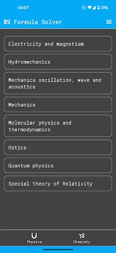 Formula Solver is a simple and easy-to-use application for physical and chemical calculations. It features 100+ of formulas in physics and chemistry, with images of the equations, descriptions of elements in the formulas and selector not only of base units for calculation but also the result unit. The formulas of physics are grouped into 12 categories, including electricity, magnetism, hydromechanics, mechanics, mechanics of vibration, mechanics of waves, mechanics of acoustics, molecular physics, thermodynamics, optics, quantum physics, and special theory of relativity. The application also features step-by-step instructions for some formulas. Whether you need help with solving equations in physics and chemistry, Formula Solver is an useful tool for any science enthusiast or student.