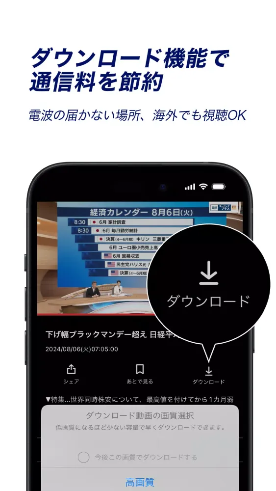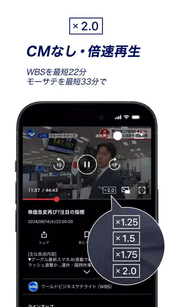 One of the standout features of the "テレ東BIZ" app is its ability to deliver essential economic information efficiently. With advanced tools such as keyword search functionality, users can quickly locate specific news articles or videos relevant to their interests. Additionally, the app supports double-speed playback, allowing you to watch shows like WBS (World Business Satellite) in just 22 minutes or Mosate in 33 minutes. This feature significantly reduces the time required to consume content without sacrificing comprehension. For those who need flexibility, the picture-in-picture mode enables background playback, enabling multitasking while staying informed. Furthermore, the download option allows offline access, making it convenient for commuters or travelers who might face connectivity issues.
