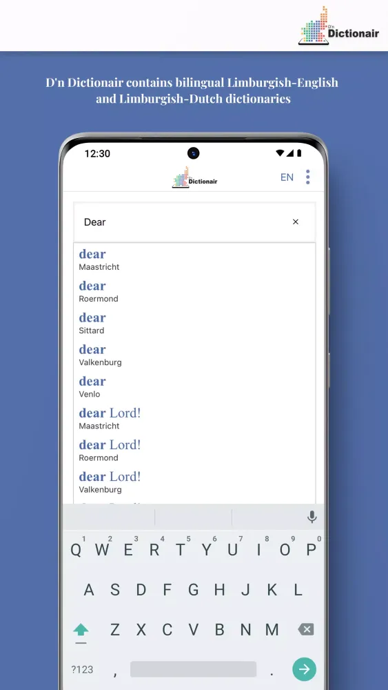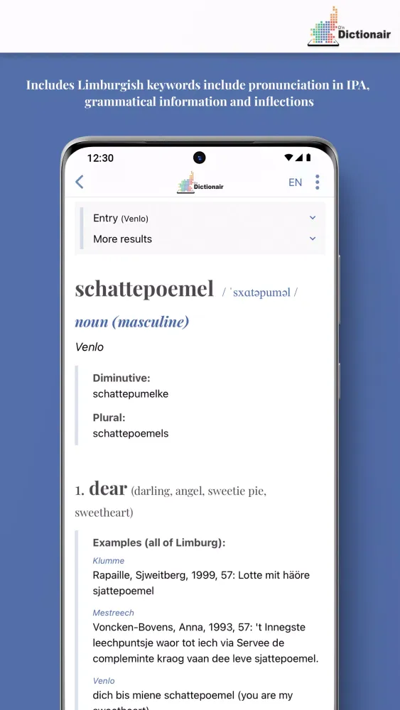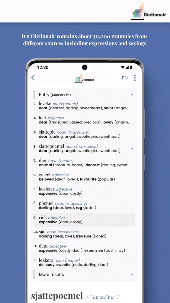 At the heart of this application lies its commitment to providing accurate and detailed information. With over 135,000 polysemous Limburgish keywords, users have access to an expansive database that covers a wide range of topics and contexts. What sets D'n Dictionair apart is its inclusion of various dialects within Limburgish, such as those spoken in Maastricht, Roermond, Sittard, Valkenburg, and Venlo. These dialects are not only preserved but also actively updated to reflect contemporary usage, ensuring that learners gain insight into the dynamic nature of these regional variations.
