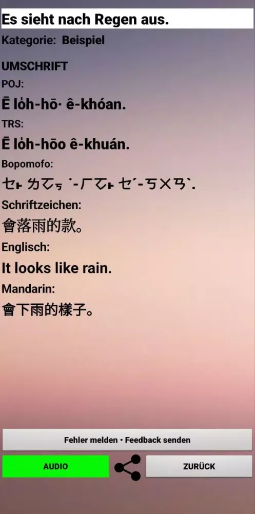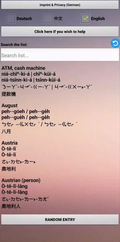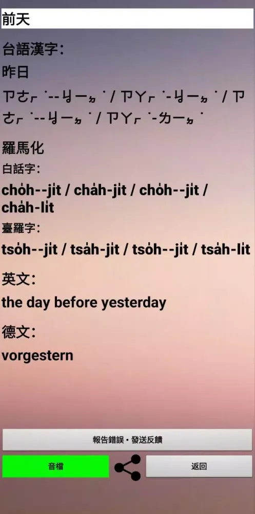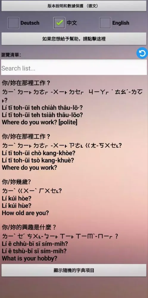 The dictionary supports multiple languages—German, English, and Mandarin—to cater to a diverse audience. Whether you're a native speaker of these languages or simply curious about Taiwanese culture, the app provides an accessible way to explore its vocabulary and structure. Each entry in the dictionary includes not only translations but also the corresponding Taiwanese pronunciation. To ensure accuracy and consistency, the app employs two of the most widely used transcription systems for Taiwanese, making it easier for learners to grasp the nuances of pronunciation.