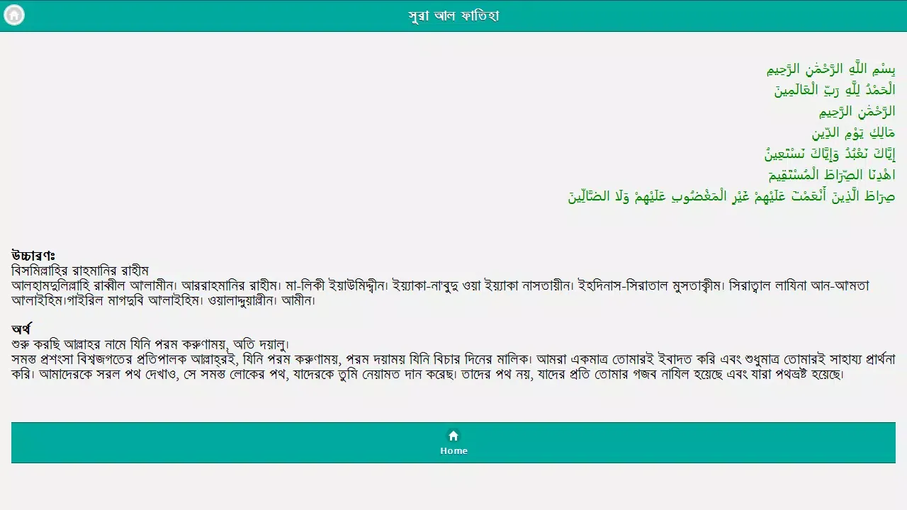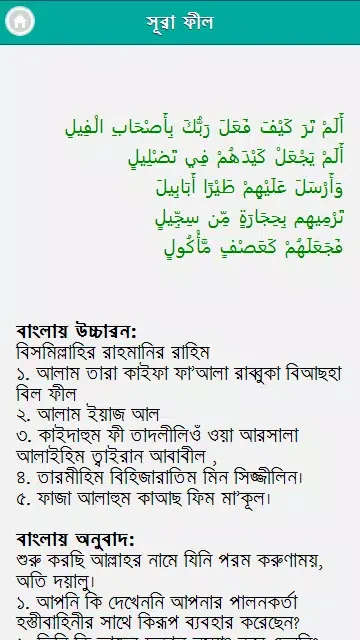 - Bilingual Support: Each Surah includes both the Arabic pronunciation and its Bengali translation, making it easier for users to follow along.