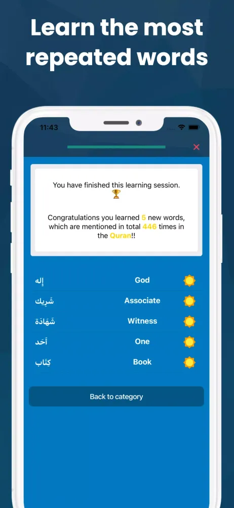 Smart Learning: Quran Progress focuses on the most commonly used Quranic vocabulary, covering over 1500 words. This means less effort for better results!