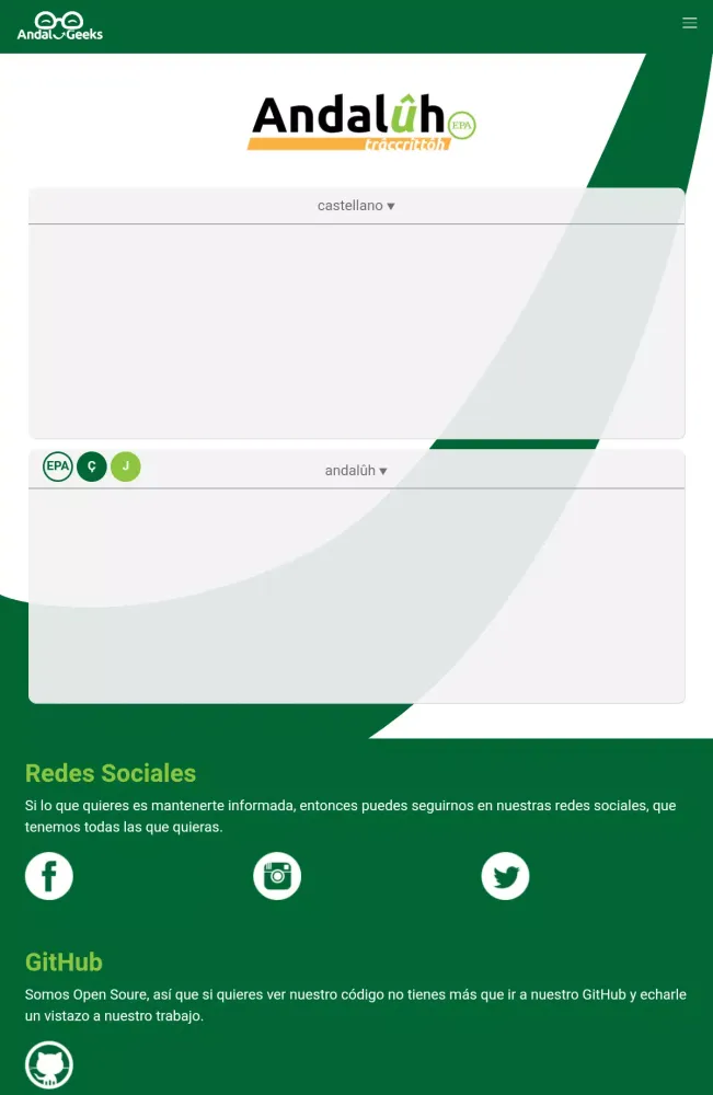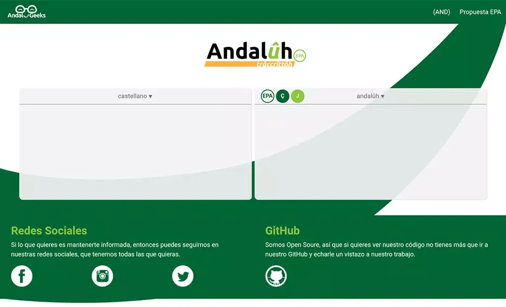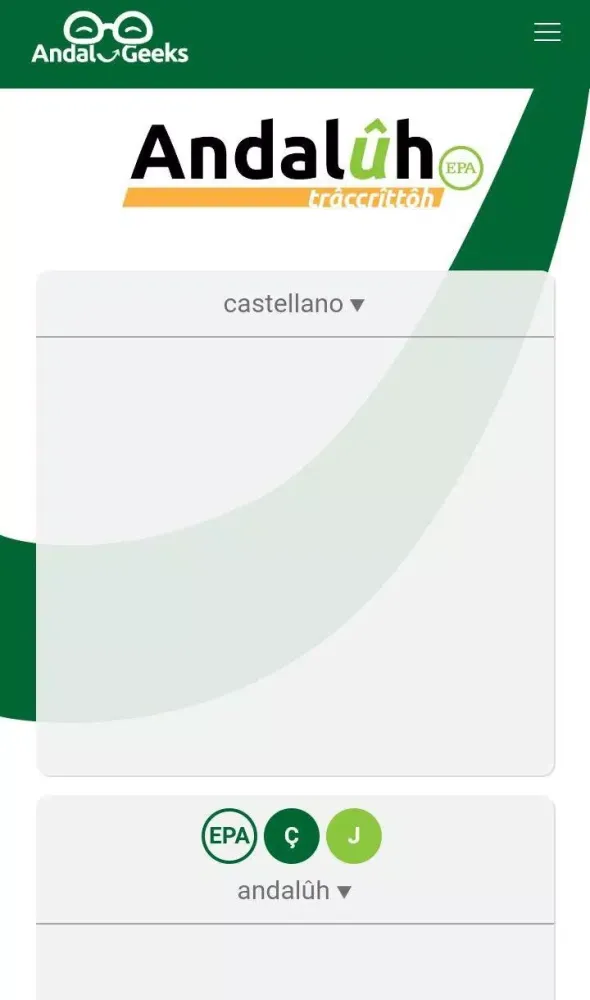 The Trâccrittôh Andalûh - Transcri application is an innovative tool designed to bridge the gap between standard Castilian Spanish (Castellano) and the unique Andalusian language (Andalûh). This tool is rooted in the EPA Proposal, which aims to preserve and promote the rich linguistic heritage of Andalusia, blending it with modern standards while maintaining historical authenticity. Whether you're a linguist, a cultural enthusiast, or simply someone curious about the nuances of regional dialects, this application offers an exciting opportunity to explore the vibrant tapestry of Andalusian speech.
