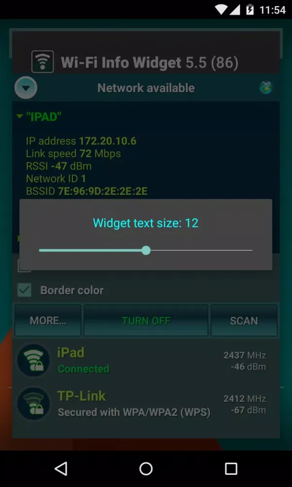 Customization is at the heart of the Wi-Fi Info Widget's appeal. Users can personalize the widget by adjusting the border color, a feature available for Android 2.2 and above. For devices running Android 3.1 and later, users enjoy even more customization options, including the ability to modify the horizontal and vertical size of the widget. On Android 4.1 and higher, users can further tweak the widget's appearance by increasing the text size via a "More..." button, making it easier to read connection details at a glance.