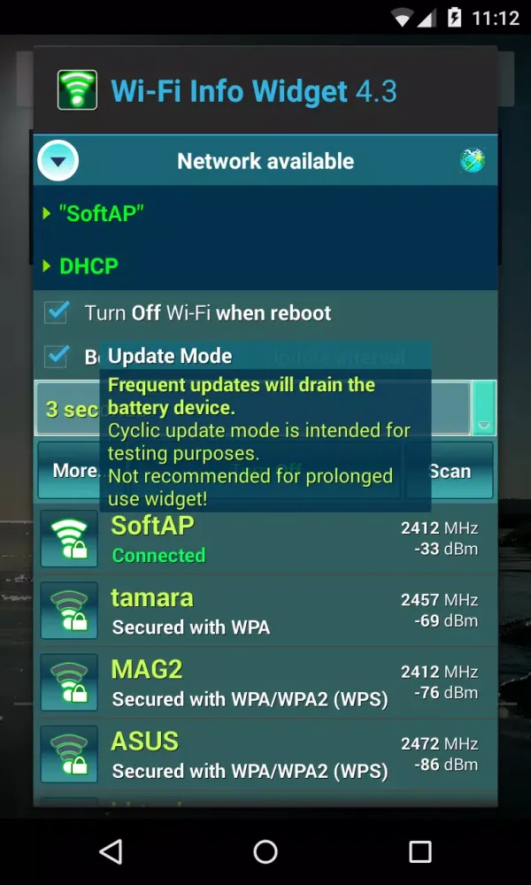To ensure accurate scanning of available networks, the Wi-Fi Info Widget requires the "Location" permission (network-based). This feature is available for Android 6.0 and above, and it's important to note that location services must be enabled on the device for optimal performance. For older versions of Android prior to 4.4.2, the widget includes a cyclic update mode that syncs with a timer for testing purposes. However, this mode is not recommended for prolonged use due to potential battery drain.