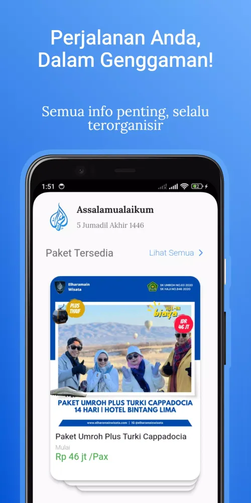 Elharamain Wisata is a comprehensive Hajj and Umrah travel application designed to simplify your journey to the holy cities of Mecca and Medina. With this app, you can plan your trip with ease, ensuring that every detail is taken care of before you embark on this spiritual journey.