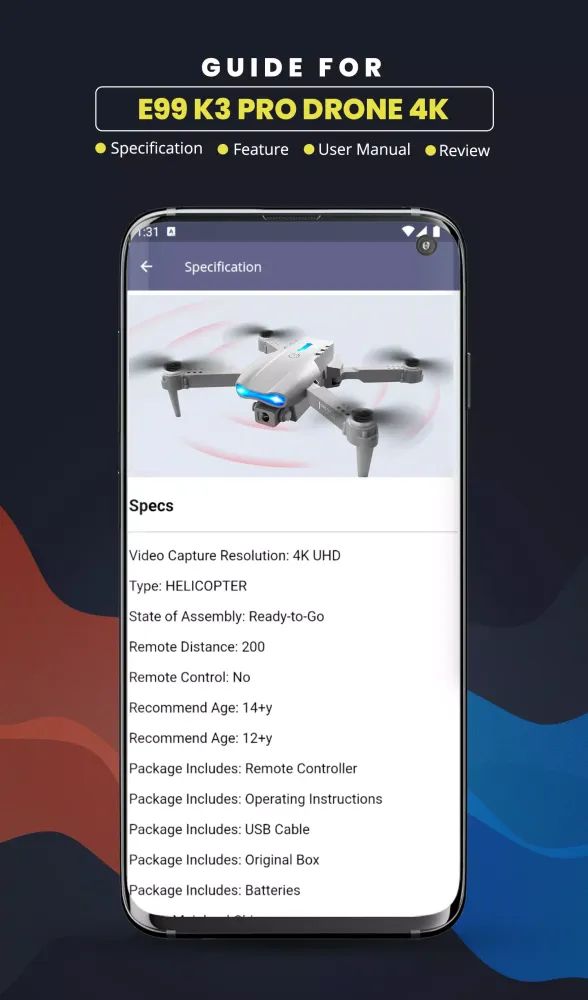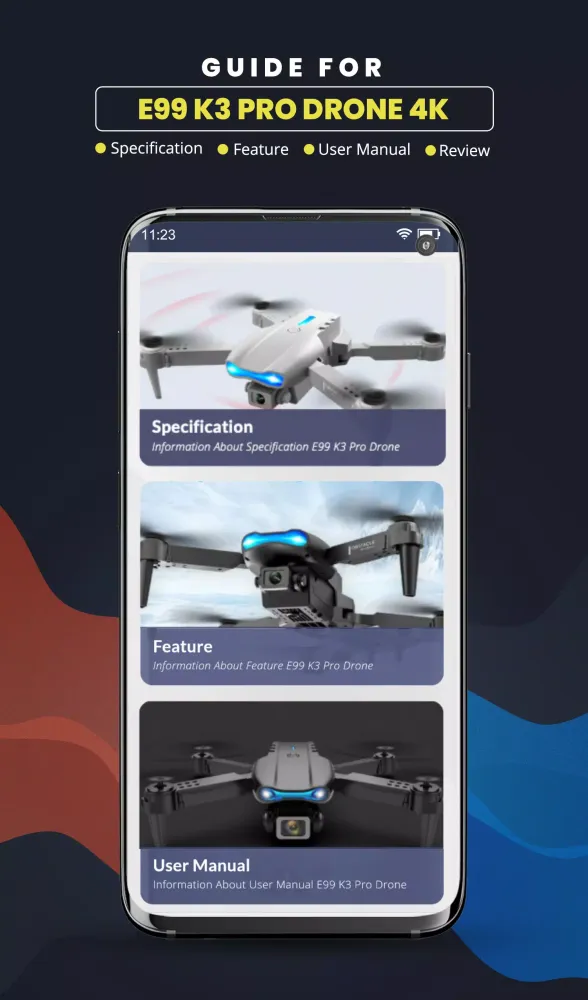 This application is not an official product of the E99 K3 PRO Drone 4K. It serves as a third-party guide aimed at providing users with comprehensive information about the drone. All images used in the app are sourced from public domains, and we respect copyright laws. If you have any requests to remove specific images, please reach out to us, and we will promptly comply.