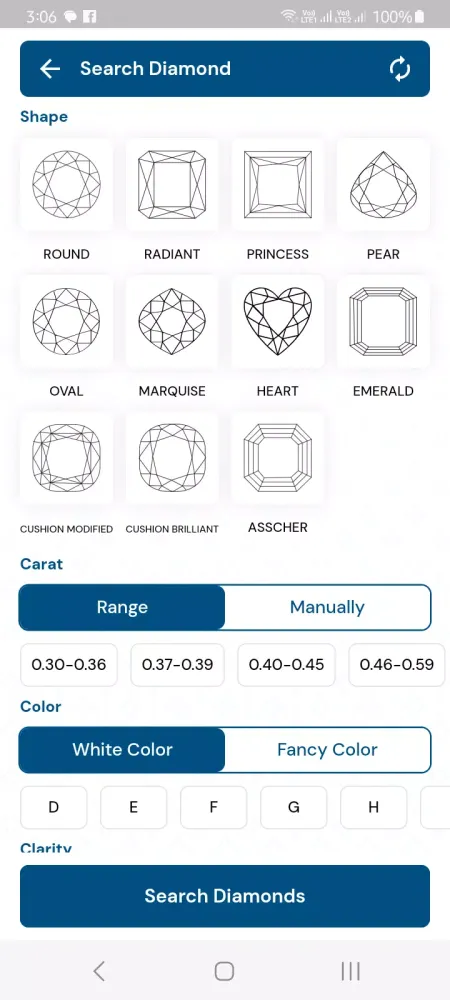 - Diamond Search: Easily find conflict-free, lab-grown diamonds online with just one click.