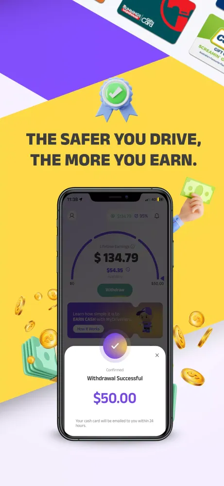 Every time you drive safely, you earn real money. The app calculates your safety score based on factors like speed, acceleration, braking, and lane adherence. Higher scores mean bigger rewards. You can then bank these trips to convert them into cash, which can be redeemed at popular retail chains nationwide.