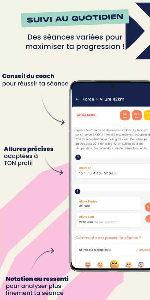 Stay motivated by tracking your sessions and progress with Campus Coach. Access various run sessions such as intervals, hills, and fundamental endurance runs. Synchronize your workouts with your GPS watch (Garmin, Coros, Suunto) to analyze your performance metrics like distance, elevation, and speed. This ensures you're always running at your optimal pace and improving steadily.