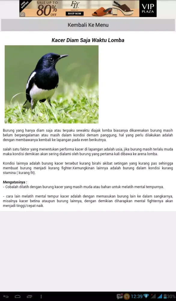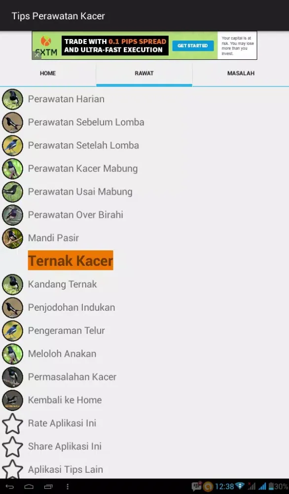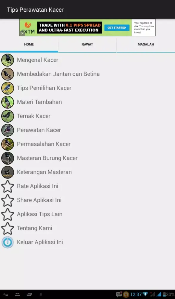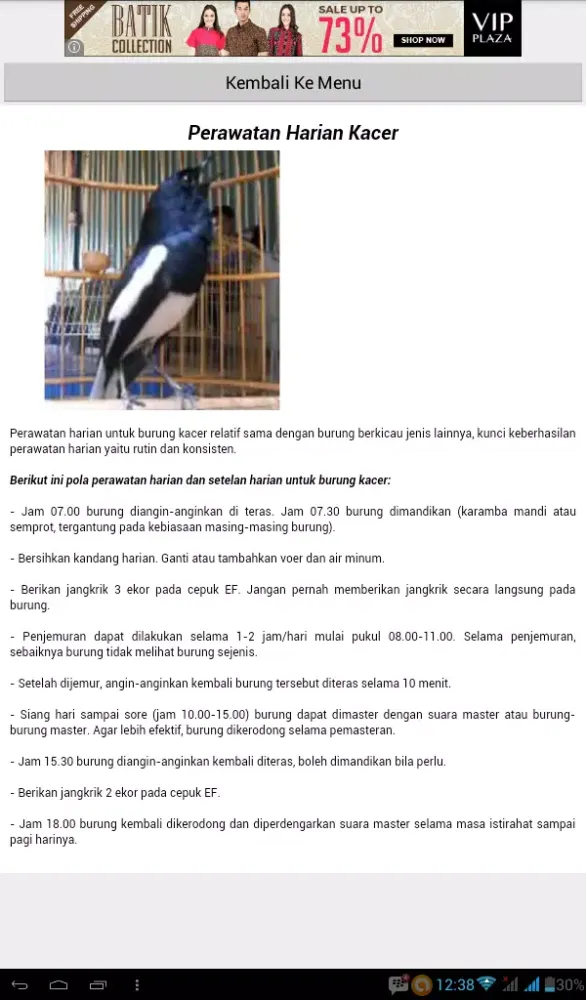 What sets this application apart is its versatility—it functions seamlessly both online and offline. Regardless of your connectivity status, you can access vital information at any time, making it an ideal tool for birdkeepers on the go. Whether you're preparing for a competition or simply seeking to improve your kacer's quality of life, "Tips Perawatan Burung Kacer" offers the tools and knowledge necessary to achieve success. Download this app today and embark on a journey of learning and growth alongside your cherished kacer bird!