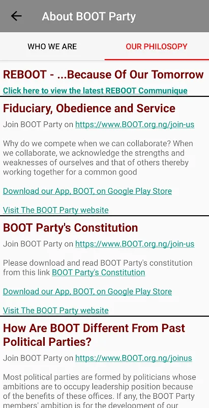 The BOOT Party App is a communication tool for BOOT Party members and will be used for conducting BOOT Party Election Primaries.
