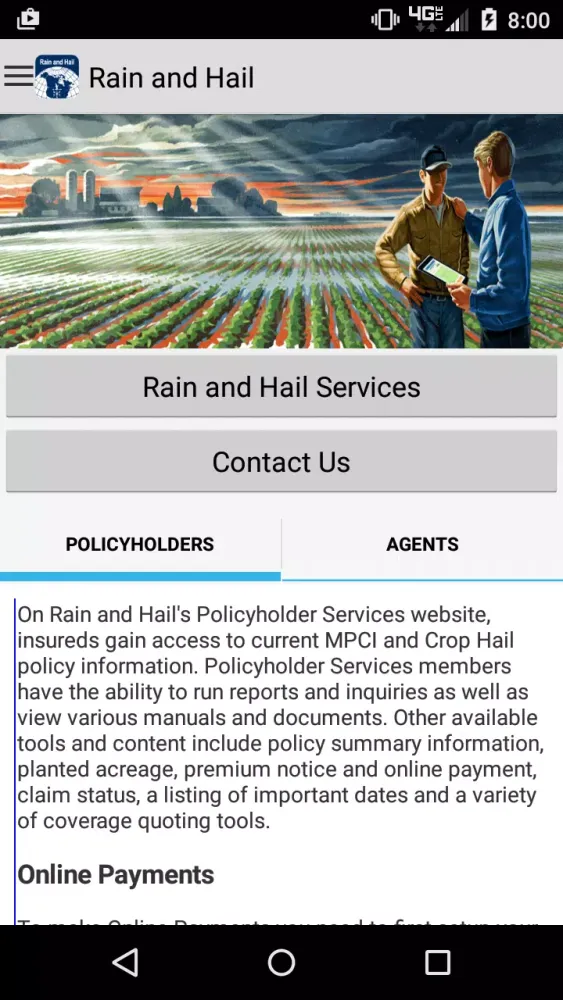 The Rain and Hail Crop Insurance application is a powerful tool designed to streamline agricultural insurance processes for both agents and growers alike. This innovative app aims to provide users with immediate access to essential services while ensuring convenience and efficiency in managing policies. Whether you're an agent handling contracts or a grower seeking peace of mind, this platform offers tailored solutions to meet your needs.