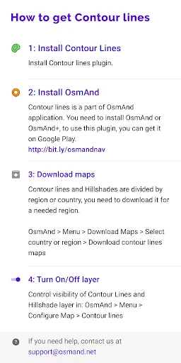 Contour lines plugin — OsmAnd is a plugin for 'Maps & Navigation — OsmAnd' app. The plugin provides extremely detailed offline topo maps that can be zoomed in and out without losing the quality. These topographic maps can also be complemented with a layer of 3D terrain representation ('hillshade'). Contour lines plugin — OsmAnd is a useful reference tool for hikers, tourists, cyclists, and any topography enthusiast.