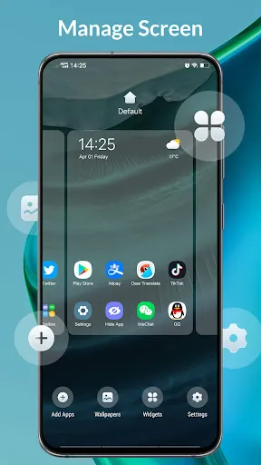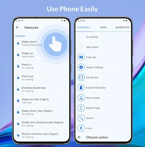 The launcher supports gestures such as swipe up/down, pinch in/out, and double-tap for quick actions and navigation.