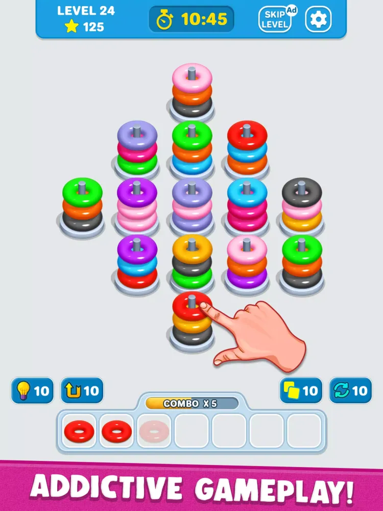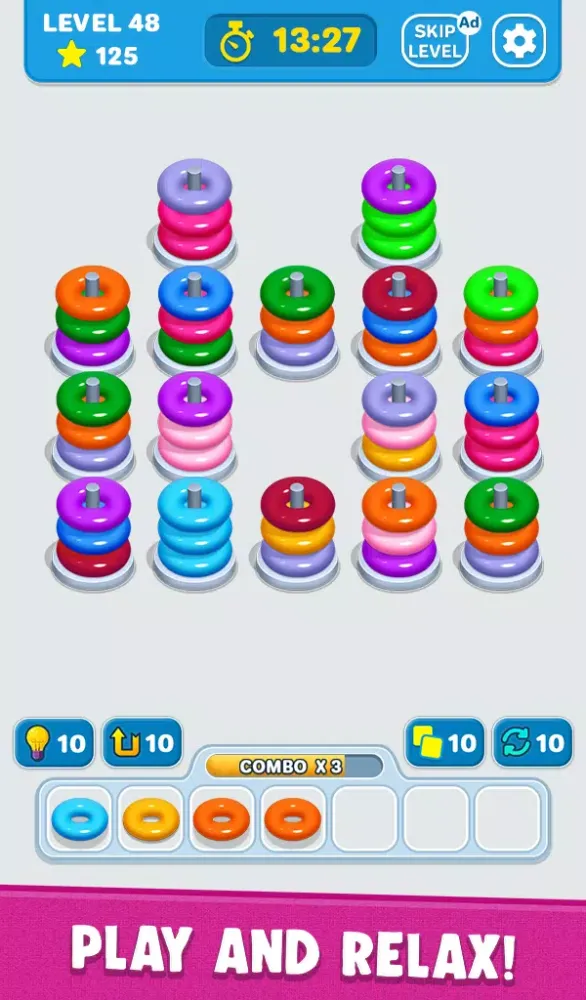 Playing Match 3D Ring is intuitive yet challenging. Simply tap on three or more identical rings to eliminate them from the board. The faster you clear the rings, the better your chances of completing the level successfully. However, time is of the essence—failure occurs if the board fills up before you can complete your task. Don’t worry though; the game provides helpful tools like hints, undo options, and extra moves to help you out when you’re stuck. These features ensure that every player has a fair chance at success, regardless of their skill level.