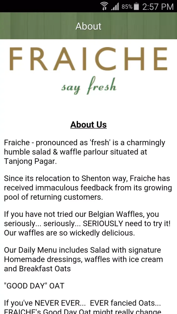Fraiche, pronounced as "fresh," is a delightful and unpretentious salad and waffle parlor nestled in the vibrant area of Tanjong Pagar. Since its move to Shenton Way, Fraiche has garnered glowing reviews from an ever-growing number of loyal patrons. If you haven't had the pleasure of trying their Belgian Waffles, let us assure you that you're missing out on something truly extraordinary. These waffles are not just any ordinary treat—they are wickedly delicious.