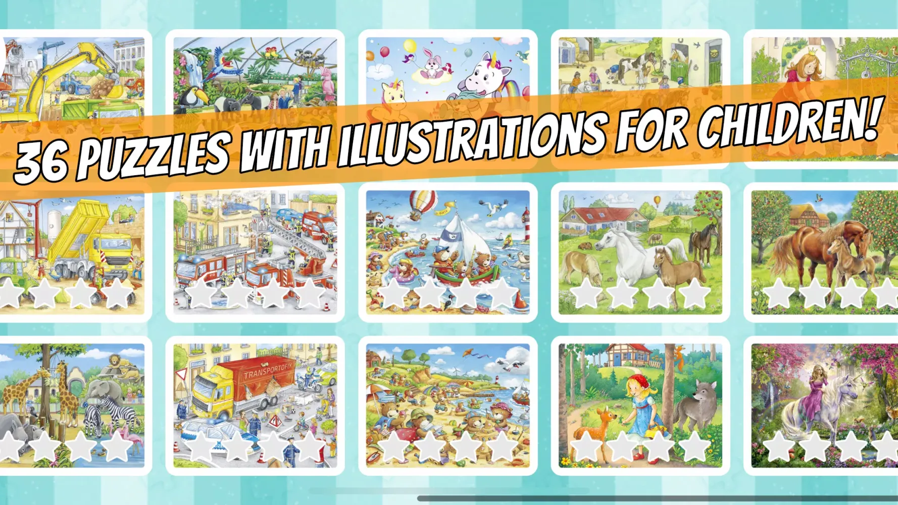 The "Ravensburger Puzzle Junior" app offers a diverse selection of 72 varied puzzle designs, suitable for both boys and girls. These puzzles feature themes ranging from cute animals from around the globe to princesses, unicorns, pirates, tractors, fire engines, and police cars. This variety ensures that children remain engaged and entertained for countless hours.