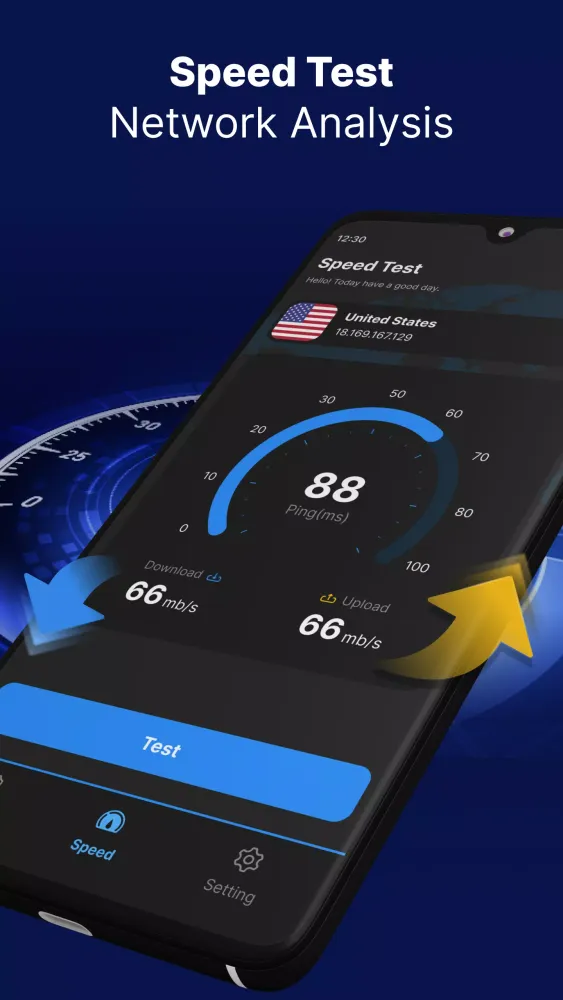 - Wi-Fi Hızınızı Test Edin: Troy VPN ile cihazınızdan doğrudan indirme ve yükleme hızlarınızı ve ping zamanlarını ölçebilirsiniz.