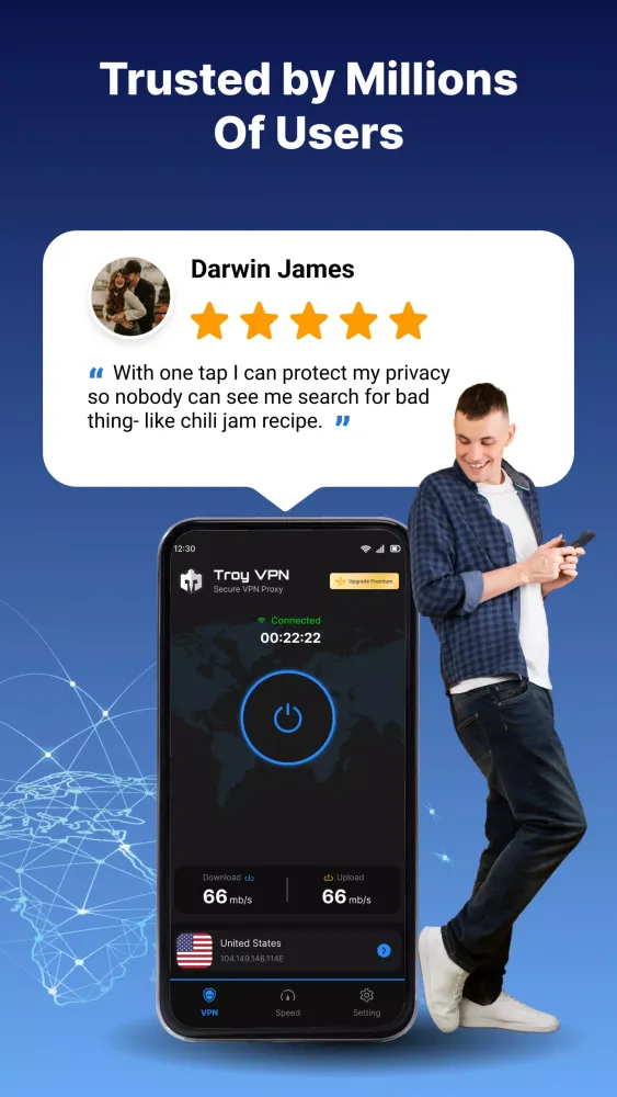 - Gizliliğinizi Koruyun: Troy VPN, tüm internet trafiğiniz için güvenli bir tünel oluşturarak çevrimiçi gizliliğinizi korur. Bu şifreleme, verilerinizin hacker'lar ve cyber suçlular tarafından ele geçirilmesini önler.