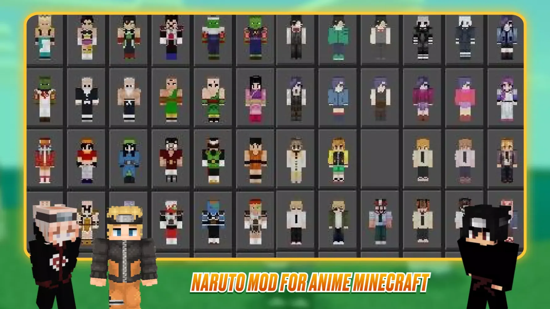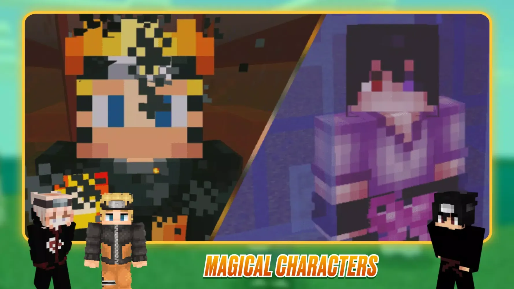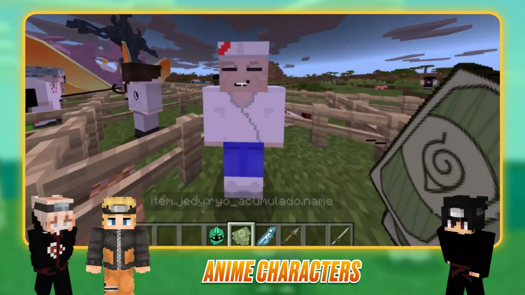 Experience the thrilling world of Naruto in Minecraft: Anime heroes from the manga come to life in the MCPE Bedrock edition! This mod introduces a vast array of skins, weapons, and animations inspired by the beloved anime series "Naruto Shippuden."