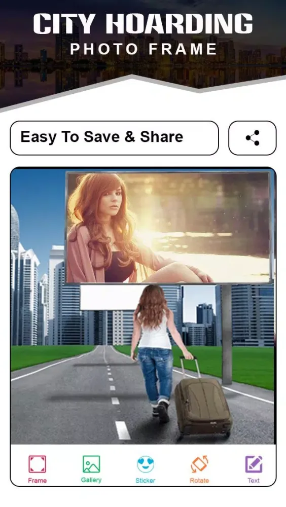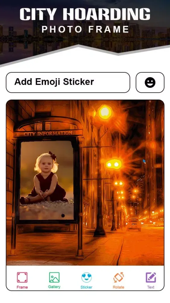 - Edit Your Photo: Customize your photo with city hoarding frames, stickers, and emojis.