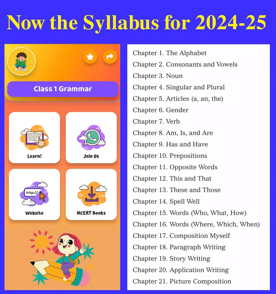 The Class 1 English Grammar Book is an indispensable resource for young learners embarking on their journey into the world of English grammar. Designed specifically for students in Grade 1, this app provides a comprehensive guide that aligns with the latest curriculum updates for the academic year 2024-25. Whether you're a parent looking to support your child's learning or a teacher seeking additional tools for classroom instruction, this app offers everything you need to make grammar fun and engaging.