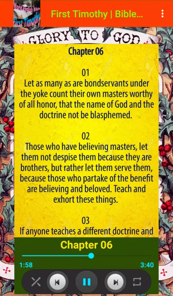 One of the standout features of this app is its offline accessibility. Whether you're commuting, traveling, or simply away from an internet connection, the ability to access the complete chapter of First Timothy without streaming ensures that you can continue your spiritual journey uninterrupted. The World English Bible (WEB) translation used in this app is a modern, open-source version of the Bible, meticulously crafted to ensure clarity and universal comprehension. As one of the few public domain translations available today, the WEB version eliminates the need for localized adaptations, making it an inclusive choice for English speakers around the globe. This translation aligns closely with the original texts, ensuring authenticity and accuracy in every passage.