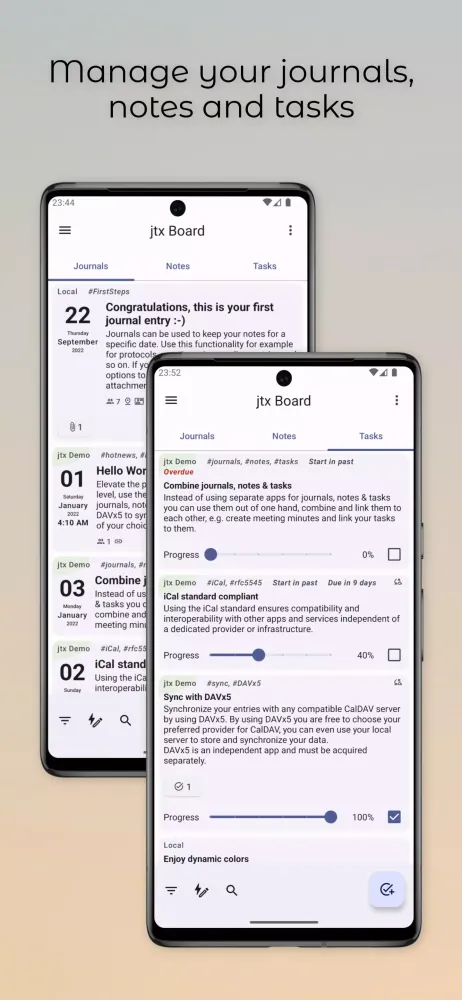 jtx Board is a powerful application designed to help you manage journals, notes, and tasks all within one integrated platform. By leveraging the iCalendar standard, jtx Board ensures seamless compatibility and interoperability across various apps and services, making it a versatile tool for both personal and professional use. Whether you're jotting down meeting notes, creating task lists, or maintaining a journal, jtx Board provides a unified solution that combines these essential functions into a single, easy-to-use interface.