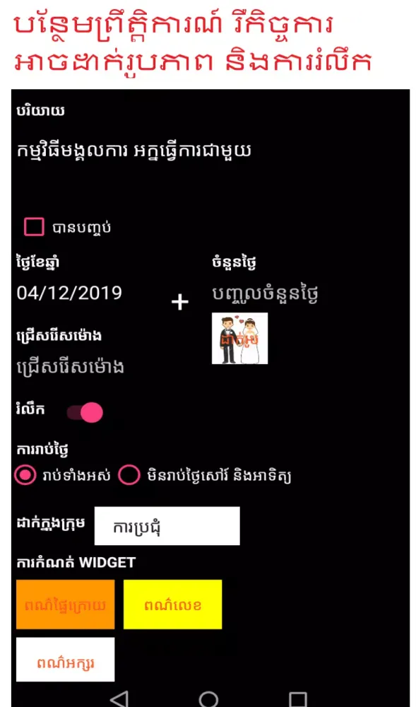 - Widget Integration: Enhance your home screen by adding a customizable widget. Customize its background color, text color, and even add an image.