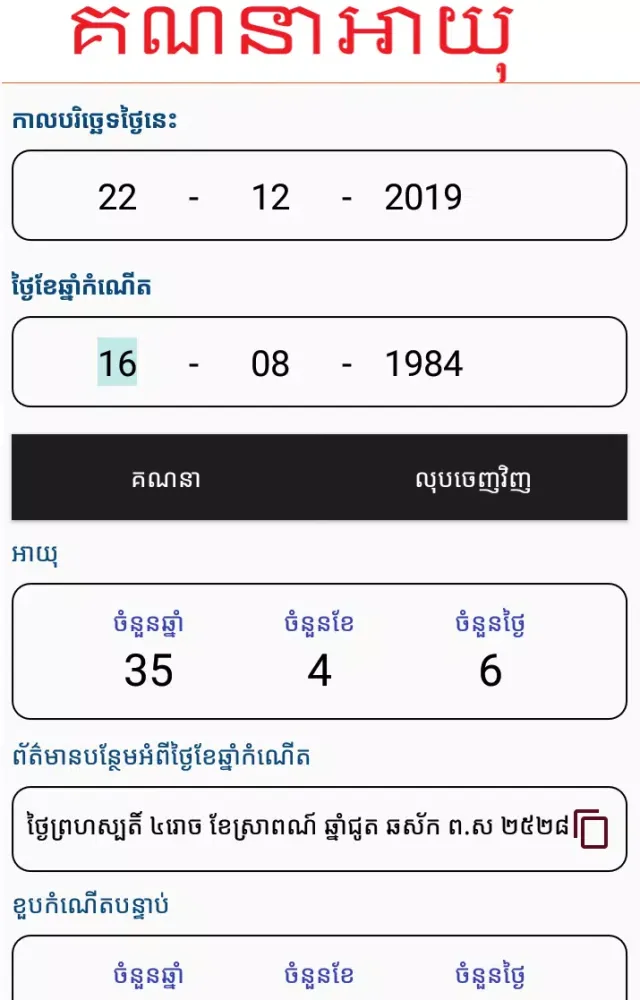 - Additional Tools: Utilize the built-in age calculator and find birthdays in Khmer.