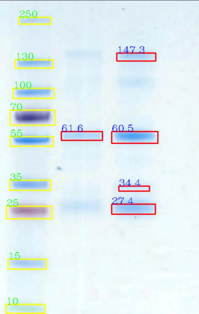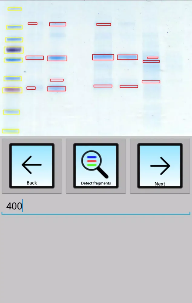- Detailed Output: Displays readings within the gel image, highlighting boxes and calculating band sizes.