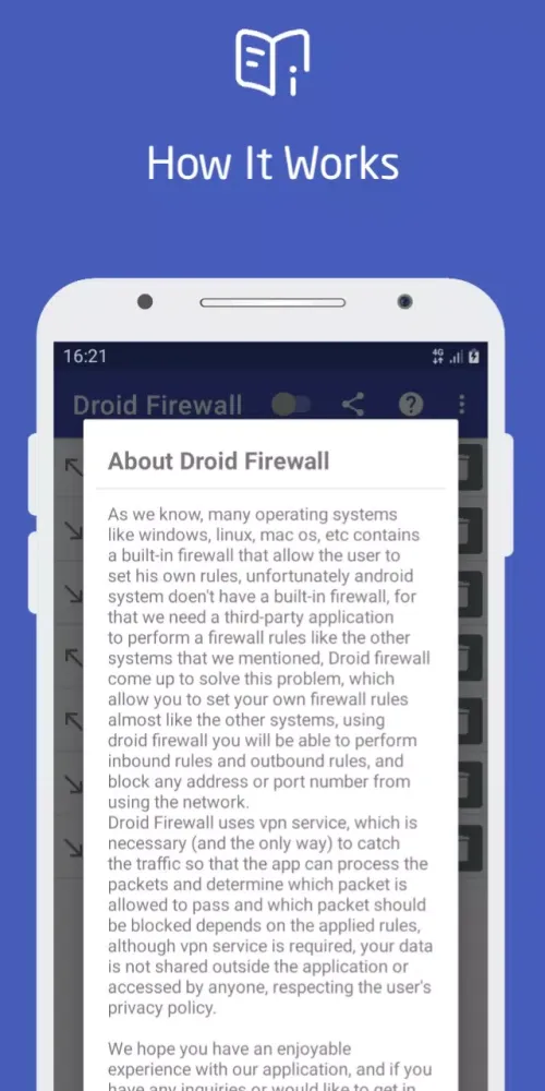 We are confident that Droid Firewall will provide you with an exceptional user experience. If you encounter any issues or have questions about the application, our team is always available to assist you. Feel free to reach out via our official email for support or feedback. Together, let’s make your Android device more secure and efficient than ever before!