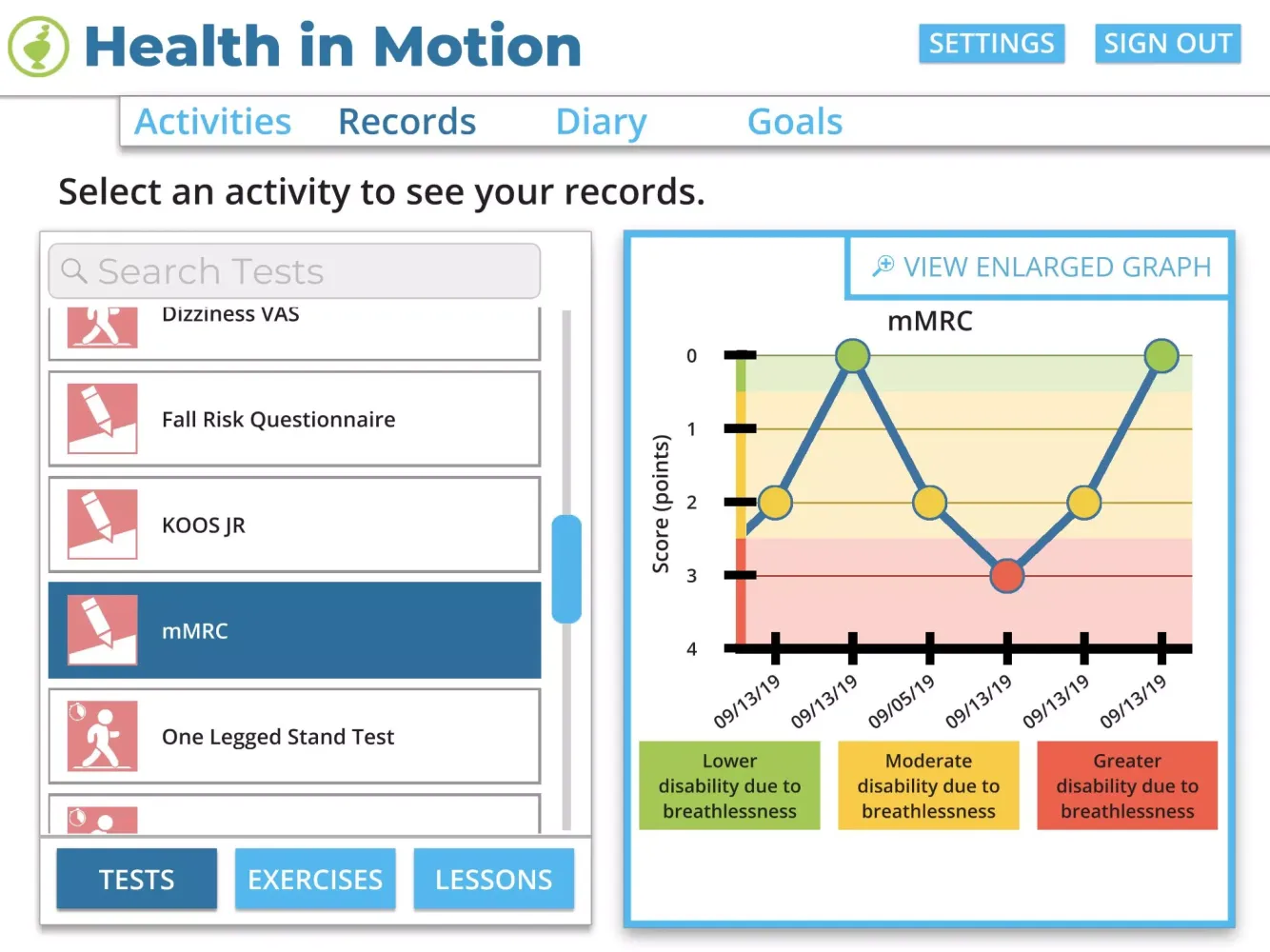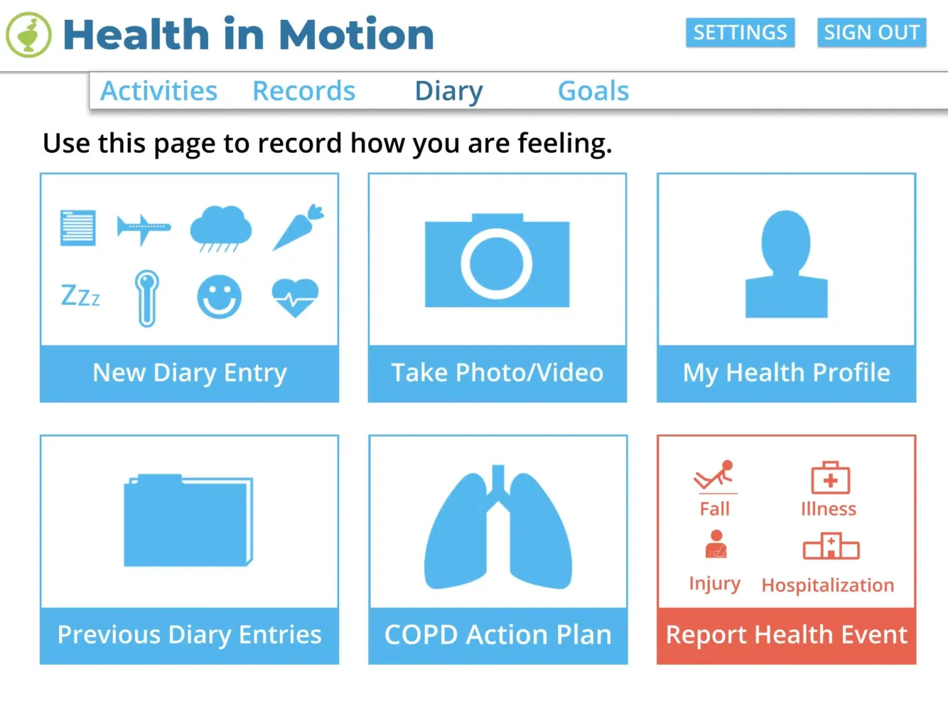 One of the standout features of Health in Motion is its ability to set personalized health goals. By identifying areas where improvement is needed, you can create actionable plans to achieve them. Whether your goal is to reduce symptoms of COPD, improve joint mobility, or simply maintain a healthier lifestyle, the app makes it easy to stay motivated and track progress over time. To aid in this process, the health diary is an invaluable tool. It allows you to log details about your medical history, medications, hospital visits, and other relevant information, providing a comprehensive overview of your health journey.