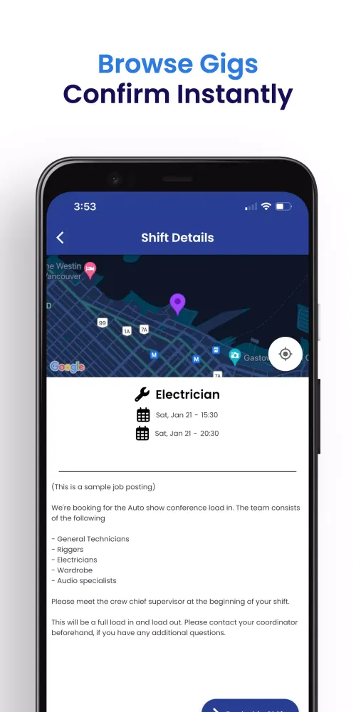 - Browse: Receive curated gig opportunity notifications that include time, date, location, employer wage, and job descriptions.