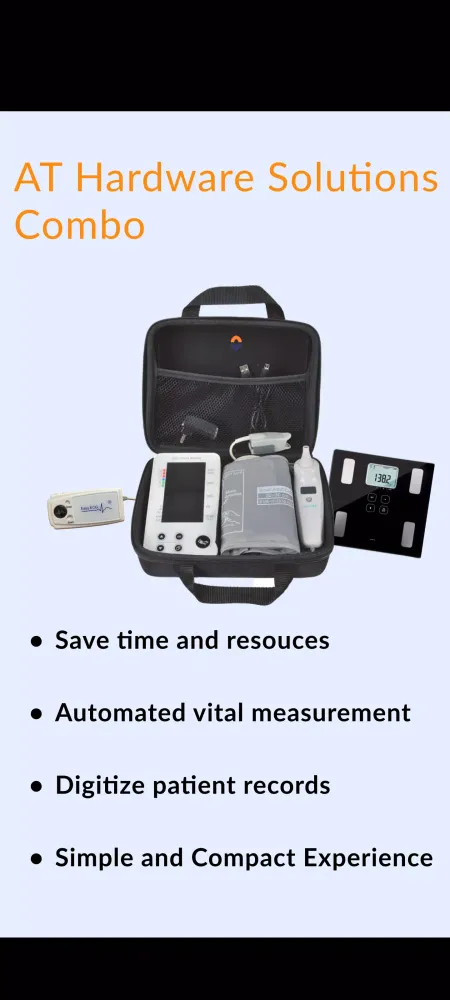 At the heart of Aarogya Wellness lies AT Hardware Solutions, designed to optimize your clinic operations. These hardware innovations save precious time and resources by automating vital measurements such as blood pressure, heart rate, blood oxygen levels, ECGs, weight, and temperature. All data is digitized instantly, eliminating the need for manual record-keeping. The compact design ensures ease of use without compromising functionality, making it perfect for both large facilities and smaller practices.