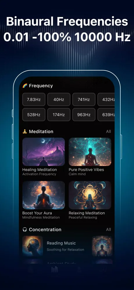 Binaural Beats - Brainwaves is an application designed to harness the power of sound to create a harmonious and therapeutic environment. Whether you're looking to reduce stress, improve sleep quality, or simply unwind, this app offers a variety of healing sounds at frequencies such as 432Hz, 528Hz, 963Hz, 417Hz, and more. These sounds are delivered through isochronic tones and binaural beats, which are scientifically proven to influence brainwave activity.