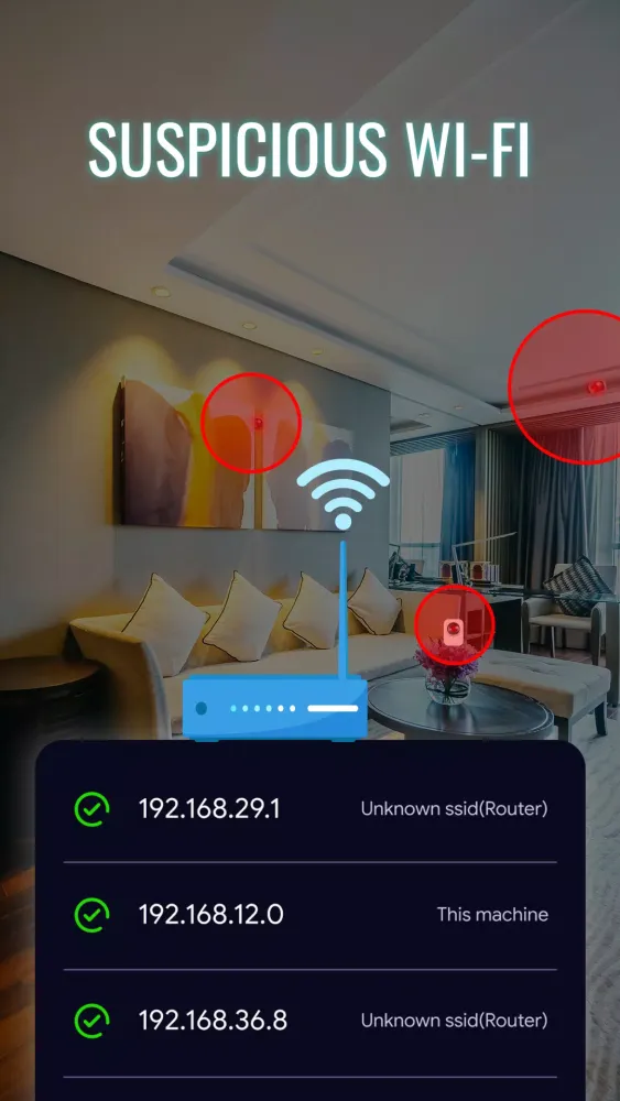 - Suspicious Wi-Fi Device Finder: Scans for unknown devices connected to your network, helping you identify potential threats.