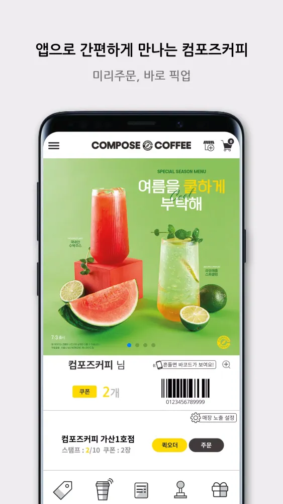 The Compose ordering app enables you to order from Compose stores where you are a member. You can check the reward status for each store in real-time. For any usage inquiries, please contact us at 1899-9243.