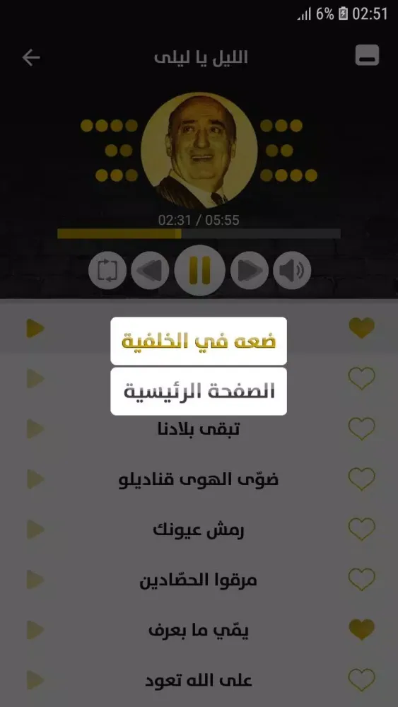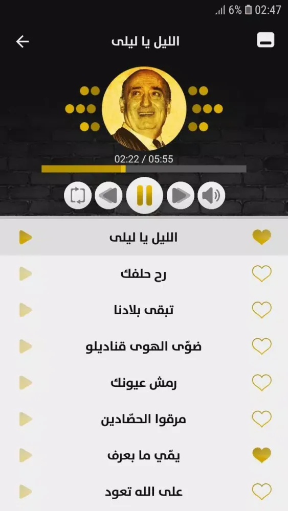 The user interface of this application has been meticulously designed to be both elegant and user-friendly. With a focus on simplicity, it allows users to navigate through the app effortlessly. One of the standout features is the favorites list, which enables you to curate your personal playlist from the extensive library of songs. Additionally, the app supports background audio playback, allowing you to enjoy Wadih Safi's melodies while using other applications simultaneously.
