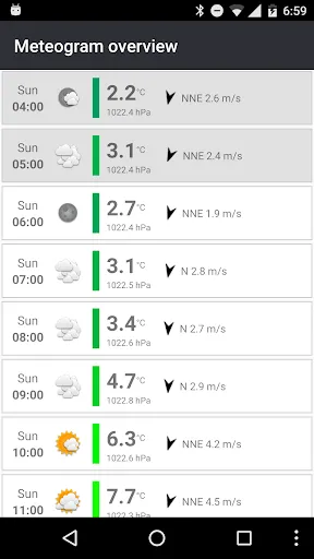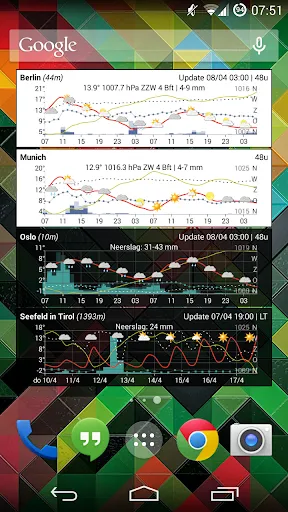 The main focus of the app consists in showing the meteogram on a small home screen widget (e.g. a 4X1 widget). Even while the widget does not occupy that much space on the home screen, it still manages showing the forecast in a clear way. Simply add a widget on your home screen, specify your location (or let the widget automatically determine your location) and the weather forecast appears on your home screen.