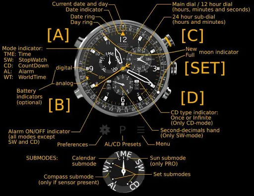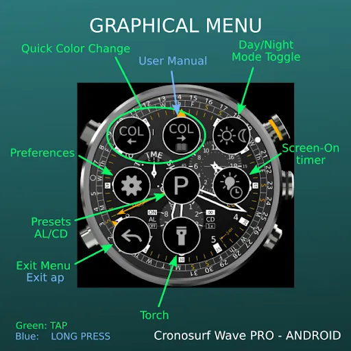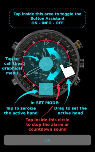 Since Cronosurf has many features, the app includes a comprehensive user manual. The Button Assistant is now integrated in the app (portrait mode). Use it to quickly getting familiarized with the basics. To activate it, tap on the area above the watch.